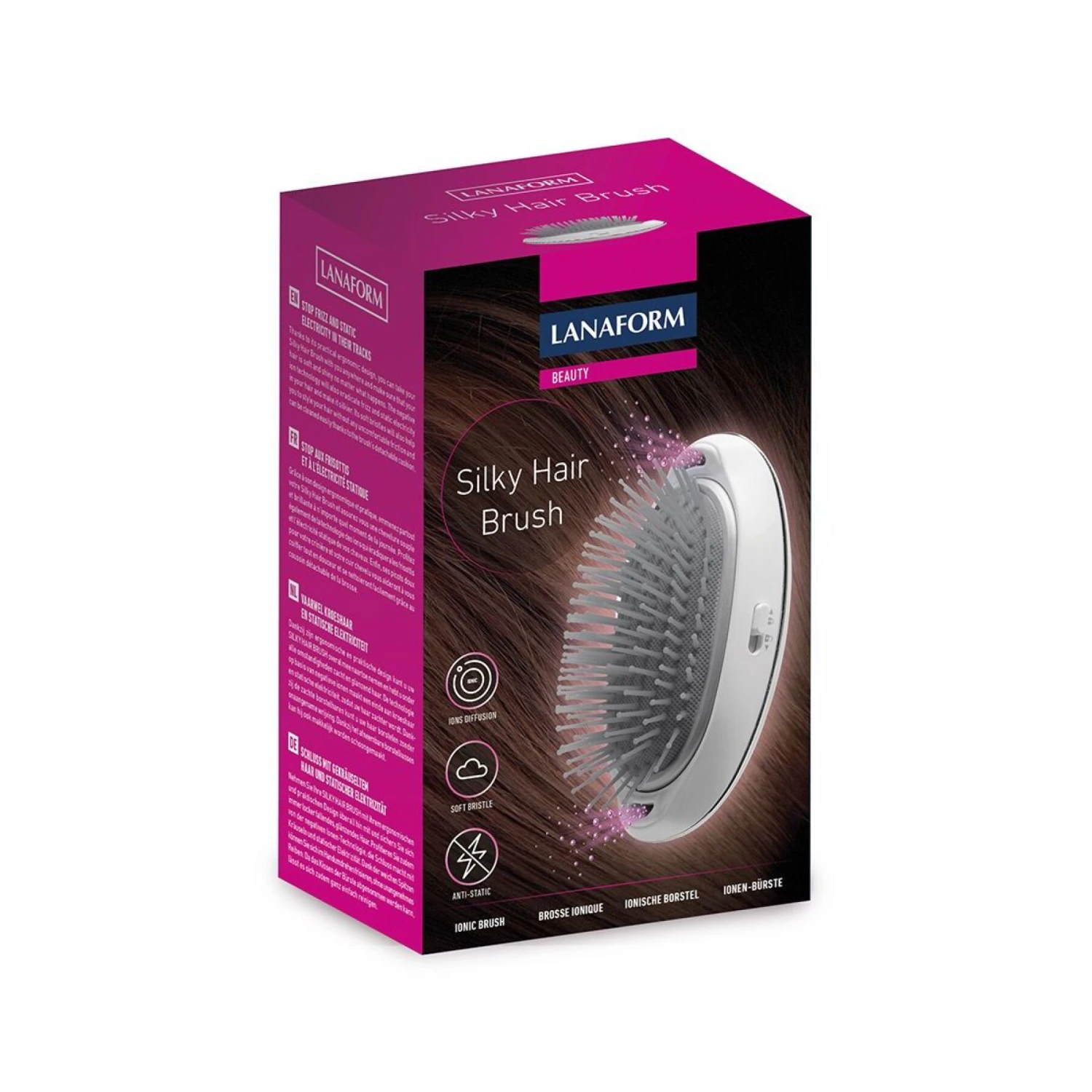 De ionische haarborstel werkt als een herstellende behandeling. Door de elektriciteit van het haar opnieuw in evenwicht te brengen door negatieve ionen vrij te laten, maakt de Silky Hair Brush je haar glad en laat het weer glanzen. Deze ionische technologie vermindert gespleten haarpunten en pluizig haar en maakt ontwarren gemakkelijker. En dankzij de zachte borstelharen is het gemakkelijker om je haar zachtjes te stylen.