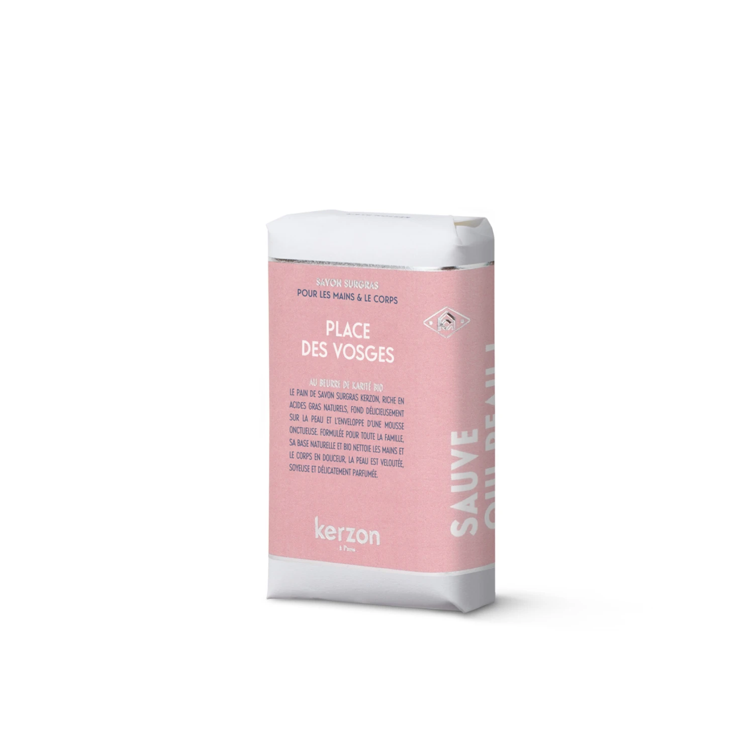 De surgras zeep Kerzon, rijk aan natuurlijke vetzuren en biologische karitéboter, hult de huid in een romig schuim en parfumeert haar subtiel.